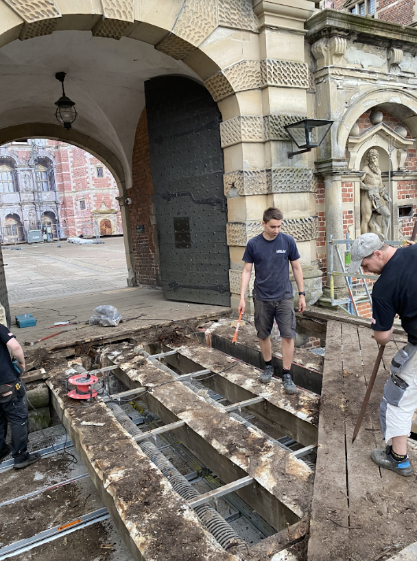 I 126 år har MVZ bidraget med vores håndværk til opførelse og restaurering af bygninger, som i dag er klassikere i dansk byggetradition. I denne omgang er det Slotsbroen på en af Statens ejendomme. Udskiftning og forstærkning af bærende dele samt udskiftning af brodæk. Plankerne til brodækket er af egetræ i dimension 8*4 tommer. Det fastsømmes med 300mm søm. Det meste af arbejdet er foregået, som aften / nat arbejde for ikke at forstyrre stedets daglige drift.